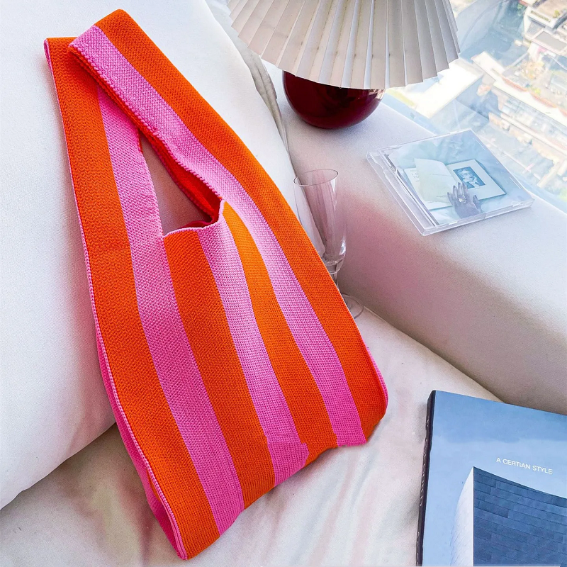 Maak kennis met de Lou Handtas. Dit gehaakte meesterwerk is zorgvuldig vervaardigd met een gestreept patroon dat moeiteloze elegantie uitstraalt.